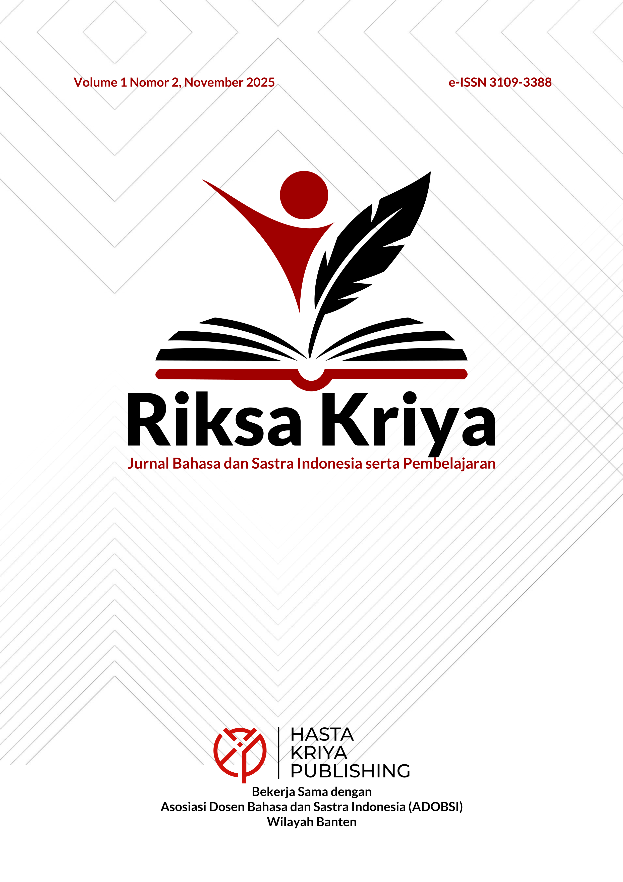 Riksa Kriya: Jurnal Bahasa dan Sastra Indonesia serta Pembelajaran (e-ISSN 3109-3388) merupakan jurnal penelitian dengan akses terbuka (Open Acces Journal) yang diterbitkan oleh Hasta Kriya Publishing. Jurnal ini menerbitkan artikel konseptual dan berbasis penelitian di bidang bahasa, sastra, dan pembelajaran yang ditulis dalam bahasa Indonesia dan/atau bahasa Inggris. Jurnal ini pertama kali terbit pada bulan Mei 2025 dengan 5 artikel dan selanjutnya pada bulan November 2025. Secara konsisten, jurnal ini akan terbit selama 2 kali dalam setiap tahunnya, yaitu pada bulan Mei dan November. Jurnal ini secara terbuka dapat diakses dan dimanfaatkan oleh para peneliti , akademisi, praktisi, profesional, dan mahasiswa untuk berbagi pengetahuan di bidang bahasa, sastra, dan pembelajaran di bidang pendidikan bahasa dan sastra Indonesia. Pengguna dapat membaca, menyalin, mendistribusikan, mencetak, mencari, atau menautkan artikel untuk tujuan yang sah lainnya secara bebas tanpa perlu izin penerbit dan penulis dengan melakukan pengutipan dan pencantuman daftar pustaka sesuai dengan ketentuan yang berlaku.